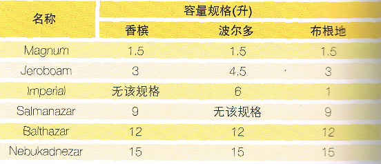 酒瓶的大小對葡萄酒陳年的時間長短有著很大的影響。酒瓶越大,葡萄酒可陳年的時間越長。一般的酒瓶容量為0.75L。而為了使葡萄酒能更好的發揮其陳釀的天賦,葡萄酒生產者特地設計了一些大容量的酒瓶。以下是這些酒瓶的專業術語: