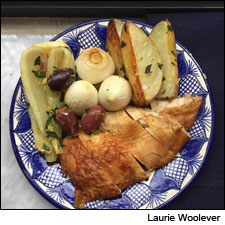 1.將烤箱溫度預熱到425°F。把土豆和茴香放在鍋裡被烤的雞身上,使雞的周圍鋪滿香料。將整雞放入烤箱烤15分鐘,再放入珍珠洋蔥,煮了10分鐘後排幹水分備用,如果有必要,再加入西芹、橄欖和香菜。鹽和胡椒調味。