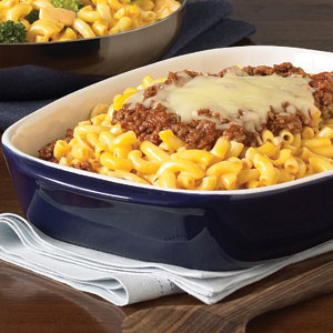 3) 在8英寸的方形烤盤上放上每一層半的肉混合物和通心粉。重複以上步驟。然後撒上馬蘇里拉乳酪。