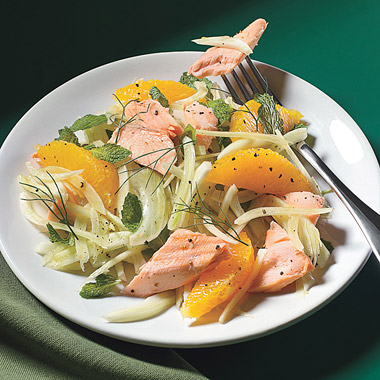 6、將剩下一只柳丁按剛才的方法切分,然後加入蛙魚肉、茴香、薄荷、和橄欖油。輕輕的攪拌沙拉直到混合。最後用鹽和胡椒調味即可食用。