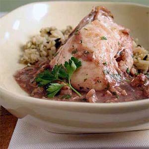 4) 把雞肉乳腺那邊朝上放入鍋中,蓋上鍋蓋,燜煮15分鐘或直到雞肉等做醬略厚。加入香菜,醋,鹽,黑胡椒。倒在米飯上即可食用。