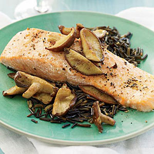 5、把三文魚片在一個有邊的烤盤上,皮膚的一面朝下,並用鹽和胡椒調味。烤15分鐘,直到三文魚片的中心都煮熟了。把野生稻米撒到三文魚片上,然後倒入紅酒汁和香菇即可食用。
