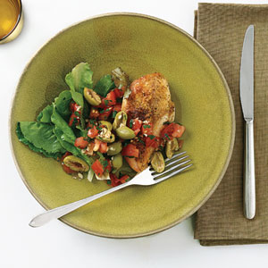 2、同時,將橄欖,番茄,蒜茸,香菜,剩下的油放在一個小碗裡,為了更好的調好味道,用勺子勺一勺橄欖油均勻的淋在烤好的雞肉上面。然後把小碗裡的小菜放在裝烤雞的盤子裡即可食用。