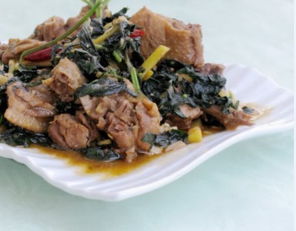 7.放入鴨塊、腐乳,加入醬料翻炒均勻。