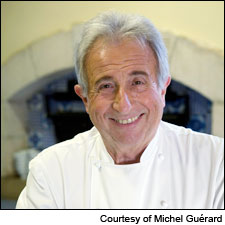 對於法國人,Guérard認為食物的享受“感覺幾乎像是一個社會與生俱來的權利,不能離開他。”,Guérard旨在培養傳統的法國菜肴,認為cassoulet和巧克力蛋奶酥,有一小部分其典型的卡路里含量。歐熱妮水療中心的餐廳已經獲得了米其林三星級榮譽37年,是著名的菜肴餐廳適合美食家和節食者。 Guérard現年81,和他的妻子也有葡萄酒水療中心的小莊園的葡萄園,主要種植原產於法國西南部的品種,如佩蒂特Manseng和Tannat 塔那,這是含有極其豐富的多酚類物質的葡萄品種。