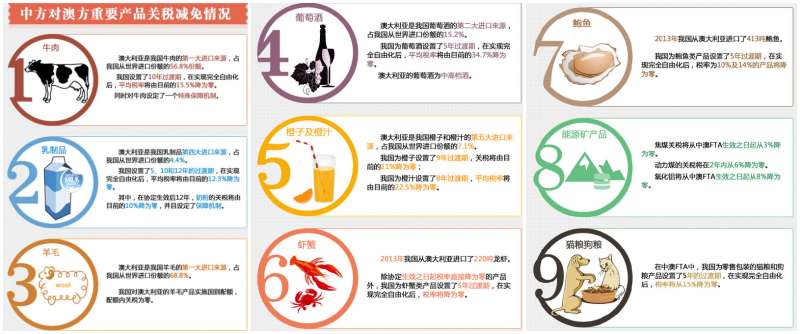 中澳自貿協定談判於2005年4月啟動,根據協定,雙方在貨物領域各有占出口貿易額 85.4%的產品將在協定生效時立即實現零關稅。這項貿易協定涵蓋貨物、服務、投資等十幾個領域,預計減稅過渡期後,雙方最終實現零關稅的稅目占比和貿易額占比將大大超過一般自貿協定中90%的水準。
