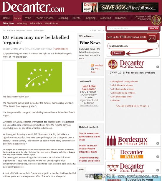 歐盟有機葡萄酒標準將於今年8月1日正式實施,獲准生產商可直接標稱“Organic Wine/Vin Biologique(有機葡萄酒)”,而在此之前只能標稱“以有機葡萄釀製”。如同其它有機產品一樣,歐盟的有機葡萄酒將帶有一個消費者容易識別的標識。