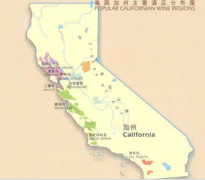 California 位於美國西南部、太平洋東海岸的狹長地帶,四周為山脈,中央為谷地,具有夏乾、冬濕的獨特氣候類型,被稱為是“葡萄酒的桃花園”。根據品種區域化和土壤氣候條件,將加州劃分為5個各具特色的葡萄產區,從南往北依次為:(1)Coachella(考施拉)產區,占加州葡萄總面積的2%;(2)Monterey(蒙特瑞)產區,占加州葡萄總面積的9%;(3)Fresno(弗瑞斯諾)產區,是加州最大的葡萄產區,加州葡萄70%集中在該地區;(4)Lodi(洛蒂)產區,占6%;(5)Napa(納帕)產區,占13%,由老齡的葡萄籐所出產的葡萄釀出的 Zinfandel(仙粉黛)更是那裡的代表。有10多個大、中型葡萄酒廠和數以百計的葡萄酒莊。其中最經典的是 Napa Valley(納帕谷)。