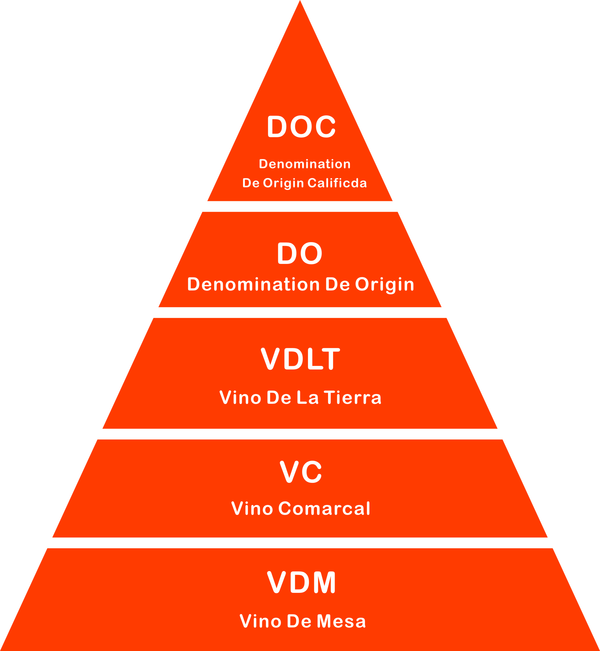 西班牙葡萄酒分級制度簡稱為DO分級制度。主要分兩個類別,分別是餐酒(VDLT、VC、VDM)和優質葡萄酒(DO、DOC)。 其中優質葡萄酒會根據在橡木桶中熟成的時間分為四個檔次,這是其他國家沒有的。其檔次同樣也必須在酒標中明確標示: