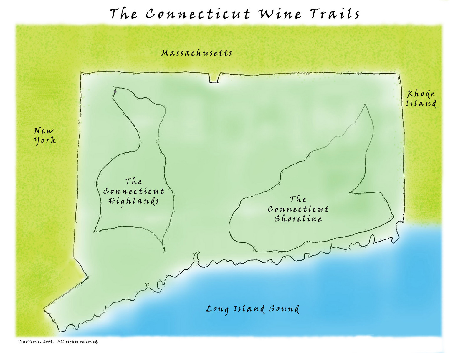 康涅狄格州的名稱源於印第安語,意為“潮汐河流域”。原為印第安人的居住地。康涅狄格州分為四個地區:東部高地,由於受到長島海峽的緩和熱帶氣候影響的緣故;形成新英格蘭東南部AVA西部的葡萄酒產區,海岸平原位於長島海灣的邊界,是一狹長的陸地,其上有海灘﹑海灣﹑與港口。康涅狄格河流穿該州中部,是新英格蘭區最長的河流。 中央山谷,涵蓋著平原及懸崖。由於康涅狄格河的海氣候影響,產區常處在溫暖的氣候下對葡萄成熟有很大的影響。塔柯尼克地區位於該州的西北角,塔柯尼克山位於其中。西英格蘭高地涵蓋了該州西部,其特徵為森林與岩石山丘。